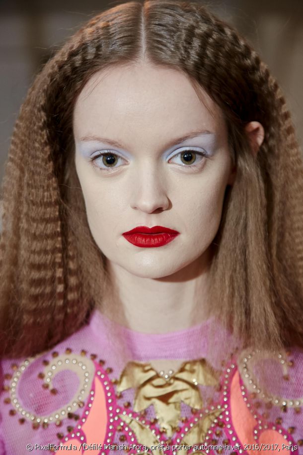 Alla sfilata di Manish Arora le modelle hanno lunghezze XXL con riga in mezzo e massimo volume realizzato con il frisè. Risultato: un look semplice ma di carattere.