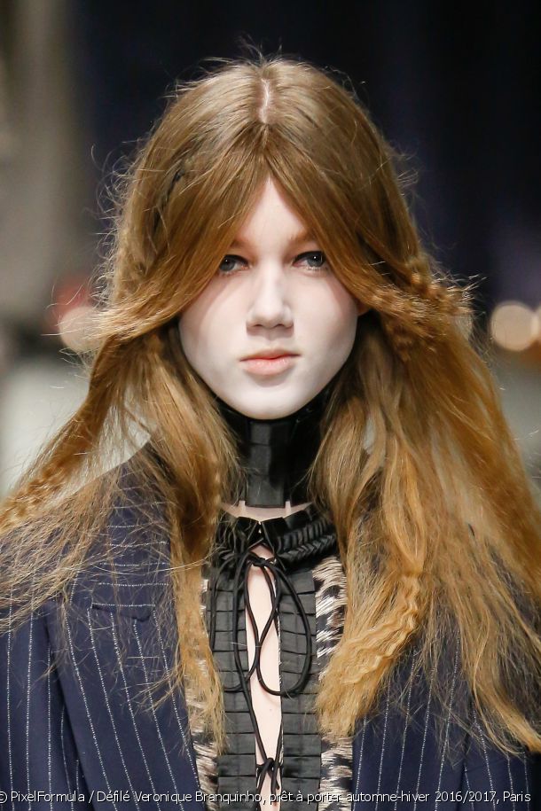Sulla passerella di Véronique Branquinho, i capelli sono lisci, scalati e con la riga in mezzo. La novità che rende questo look unico è l’effetto frisè che viene ricreato unicamente sulle radici, lle mezze lunghezze o le punte.