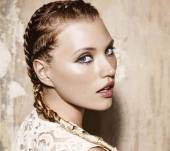 Coda di cavallo sul lato con treccia sul retro ed una ciocca sull’occhio per creare effetto mistero. Si avvolge con un nastro.