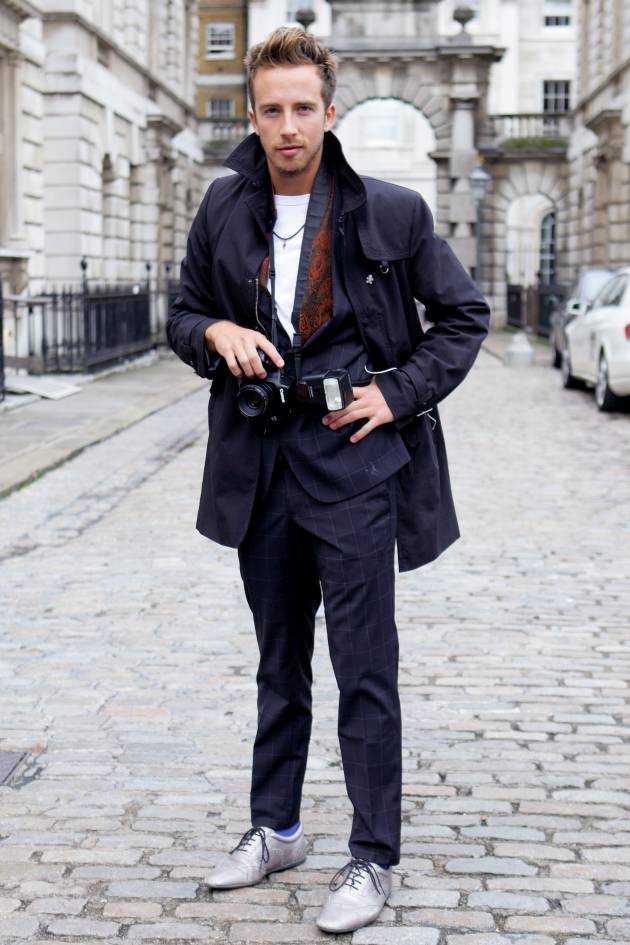 Il suo look? Da dandy moderno. Fotografo, porta la macchina fotografica appesa al collo, come in accessorio. Un completo a quadri blu notte è il pezzo forte del suo look del giorno. Sopra, un trench negli stessi toni dà il tocco finale a questo look molto elegante e perfettamente studiato. Ai piedi, un paio di derby metallizzate aggiunge un pizzico di originalità.