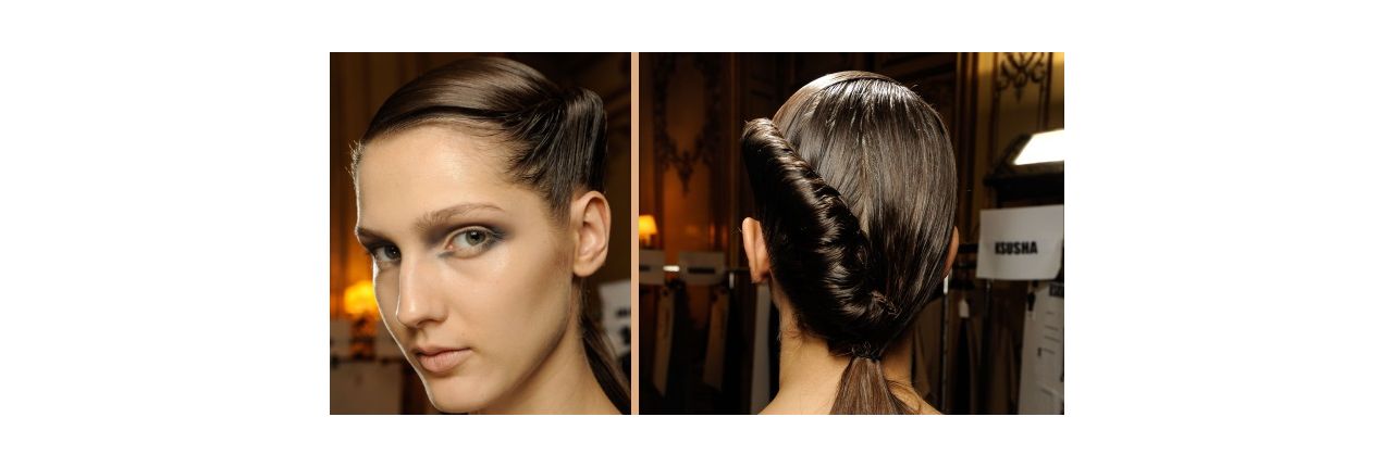 Come realizzare la coda di cavallo attorcigliata. Per una coda di cavallo attorcigliata di tendenza dovrai trarre ispirazione dall’acconciatura della sfilata Arzuaga (qui sopra). Traccia una riga molto bassa di lato e districa i capelli con una spazzola. I capelli sulla parte alta della testa devono essere appiattiti con l’aiuto di un prodotto per lo styling che deve creare un effetto wet look e permetterti di avere un’acconciatura ben ordinata. Attorciglia quindi i capelli del lato opposto alla riga. Legali a livello della nuca con un elastico con gancetto. Per assicurare il massimo della tenuta spruzza una nuvola di lacca.