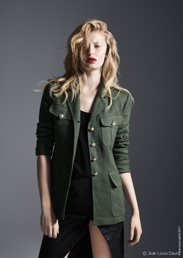 I capelli sono lavorati con spazzola e phon per dare movimento e leggerezza allo styling. Per creare il volume alla radice: Design Mousse Urban Style di Jean Louis David.