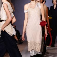 Inizia col tracciare una riga di lato. Raccogli poi tutti i capelli all’altezza della nuca. Dividi la chioma in due e fai passare la parte di sinistra su quella di destra e poi sotto. Riportala in alto verso la nuca, proprio nel punto in cui è iniziata l’acconciatura. Per imitare la petttinatura della sfilata lega i capelli utilizzando un elastico sottile. Lascia anche qualche ciocca libera per sottolineare l’effetto. Termina spruzzando una nuvola di lacca per migliorare la tenuta dell’acconciatura, da mattina alla sera.
