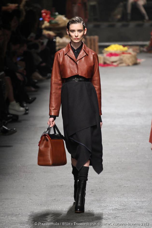 Acconciature maschili anni 20-30. Visto sul défilé Trussardi, il taglio alla maschietta con effetto bagnato ricorda le pettinature maschili con la gommina tipiche degli inizi del Ventesimo secolo. Pettinature ben fissate, ultrasofisticate con righe nette e capelli ben lisciati. Adattata al gusto di oggi grazie a Jean Dujardin nel film The Artist, questa acconciatura non è più riservata soltanto agli uomini…