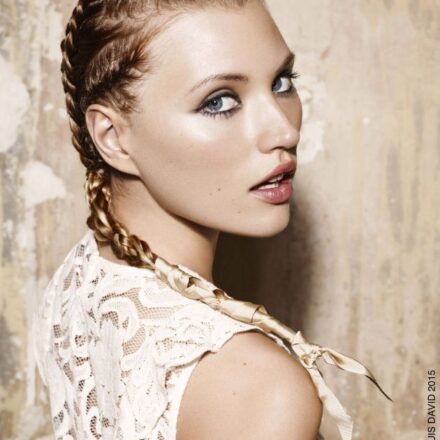 Collezioni Coiffage JourGioco di trecce di larghezze diverse. 5 trecce geometriche per creare divisioni ben definite. Le trecce poi si riuniscono sulla nuca e sono annodate fra loro. Un nastro raccoglie l’insieme. -