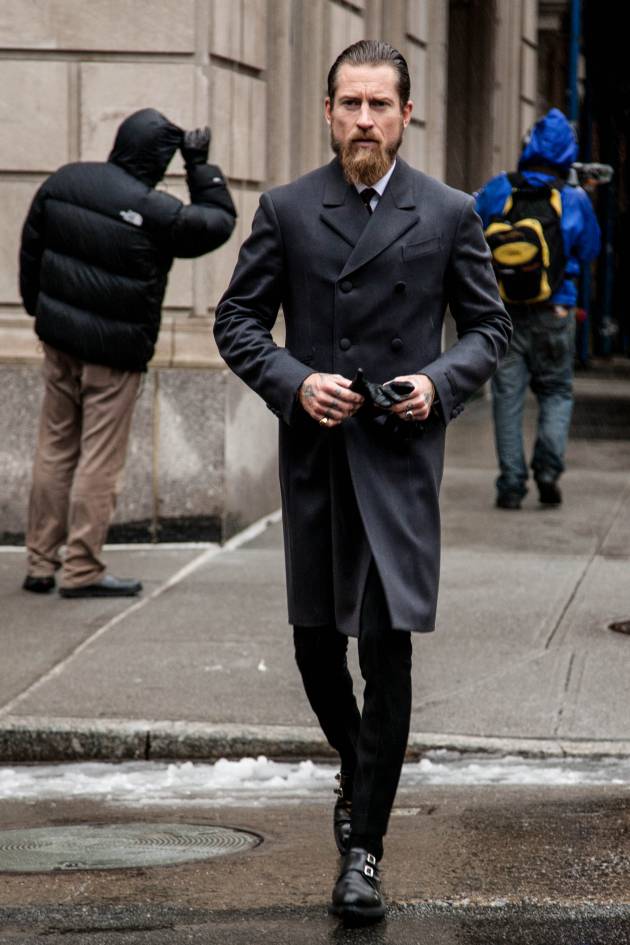 Il suo look? Scuro ed elegante. Come il pizzetto e la pettinatura, il look del nostro streetstyle è particolarmente studiato. Pantaloni slim e scarpe nere sono indossati con una camicia bianca e una cravatta nera. La stagione invernale richiede un cappotto: il nostro streetstyle ha quindi deciso di portarne uno grigio mélange. Qualche anello, un paio di guanti e il gioco è fatto!