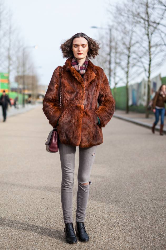 Il suo look? La sua mise è trendy e sofisticata allo stesso tempo. È un melange riuscito tra capi di ispirazione classica, rock e neo-grunge. Indossa un cappotto "effetto pelliccia" marrone, capo insostituibile di questa stagione! L’ha abbinato a un paio di jeans grigio chiaro bucati sul ginocchio. Quanto alle scarpe, un paio di stivaletti in pelle le regalano uno stile assolutamente fashion. Una borsa a tracolla e un foulard nei toni del prugna completano il look in maniera discreta.
