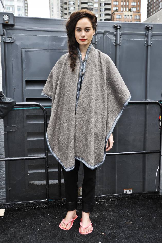 Il suo look? Eclettico. Il nostro streetstyle del giorno ha costruito il suo look intorno a un paio di pantaloni neri risvoltati a livello delle cavilgie. Ai piedi un paio di infradito, perfette per l’estate e per le alte temperature. Indossa poi un poncho su una t-shirt semplice per premunirsi contro i colpi d’aria!