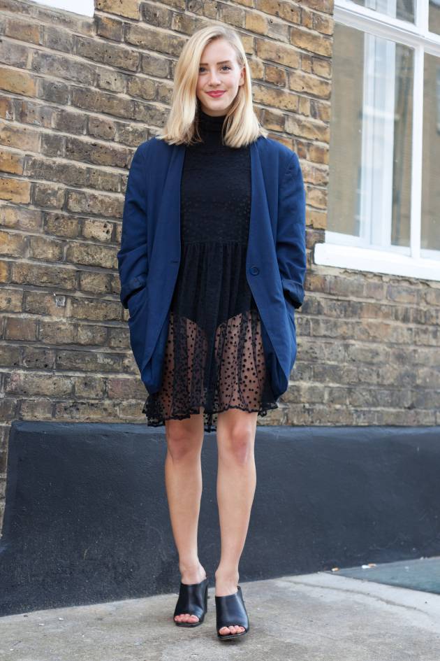Il suo look? La nostra biondina gioca la carta del maschile-femminile. Compensa lo stile maschile della giacca oversize col biondo dei capelli e col suo taglio composto. La scelta dei colori, piuttosto scuri, contrasta perfettamente con quello dei capelli.
