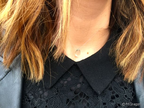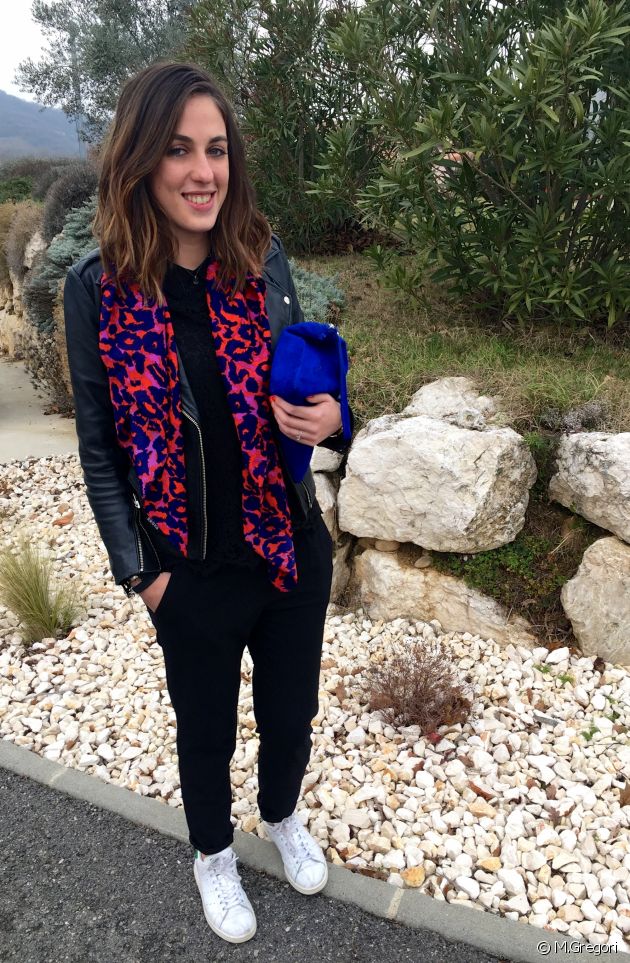 “Adoro tutto ciò che è in pizzo, come questa camicetta che ho acquistato da Pimkie, perfetta sui miei pantaloni da smoking di Zara o con dei jeans skinny. Per dare un tocco colorato e staccare da un total look black, ho deciso di abbinare degli accessori colorati e un paio di Stan Smith bianche, very cool”.