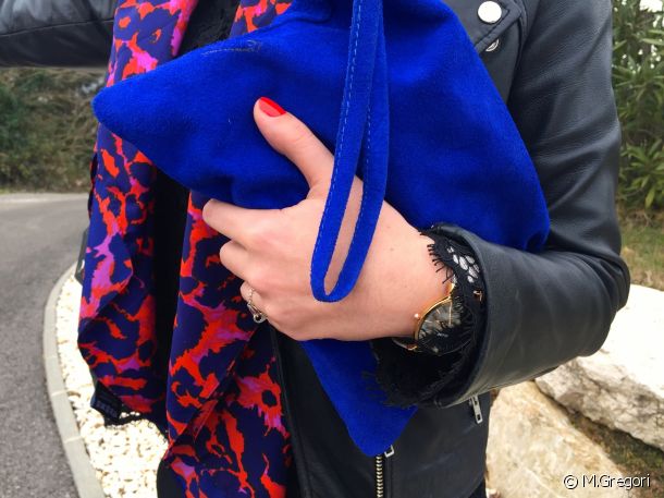 “Nero, bianco e grigio che amo abbinare con colori molto intensi per dare un po’ di contrasto. Oggi, ad esempio ho scelto un foulard di Diane Von Fustenberg rosa leopardato e una pochette blu elettrico che ho scovato su Amazon”.