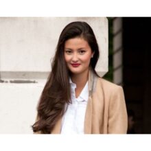 Il suo look? Quello della perfetta working girl moderna! Indossa una gonna color crema asimmetrica con una camicia bianca con solo qualche bottone sbottonato. Una giacca beige abbinata agli stivali leopardati aggiunge un pizzico di colore e di originalità. In mano, una borsa nera rifinisce il look. Un tocco di rossetto e il gioco è fatto!