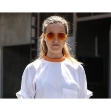 Il suo look? Sportiva fino all’ultimo dettaglio, la nostra protagonista del giorno mantiene però un look femminile e di tendenza. Alla minigonna blu e alla t-shirt bianca con collo arancione ha abbinato accessori fluorescenti. Ed ha osato gli occhiali da sole a specchio, modello di riferimento della stagione. Una mise perfetta per una sportiva come lei.