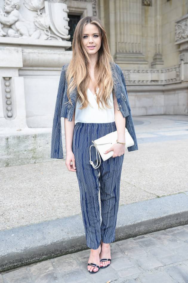 Il suo look? Indossa una mise primaverile composta da un paio di pantaloni carrot fluidi a righe e una canotta bianca scollata. Per quanto riguarda gli accessori, una pochette bianca e un paio di sandali rafforzano il tocco elegante del suo beauty look. Ha infine optato per un make-up sofisticato: i suoi occhi azzurri sono valorizzati da uno smoky eye leggero.
