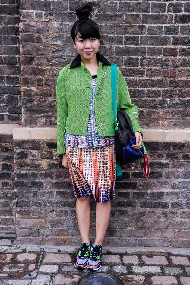 Il suo look? Eclettico. Per il nostro streetstyle del giorno, più colore c’è e meglio è! Al top nei toni del malva ha abbinato una gonna arancione. Contro il freddo ha scelto una giacca verde con il collo nero. Per completare il suo look coloratissimo, un paio di sneakers multicolori e una borsa a tracolla. Un look degno di un arcobaleno!