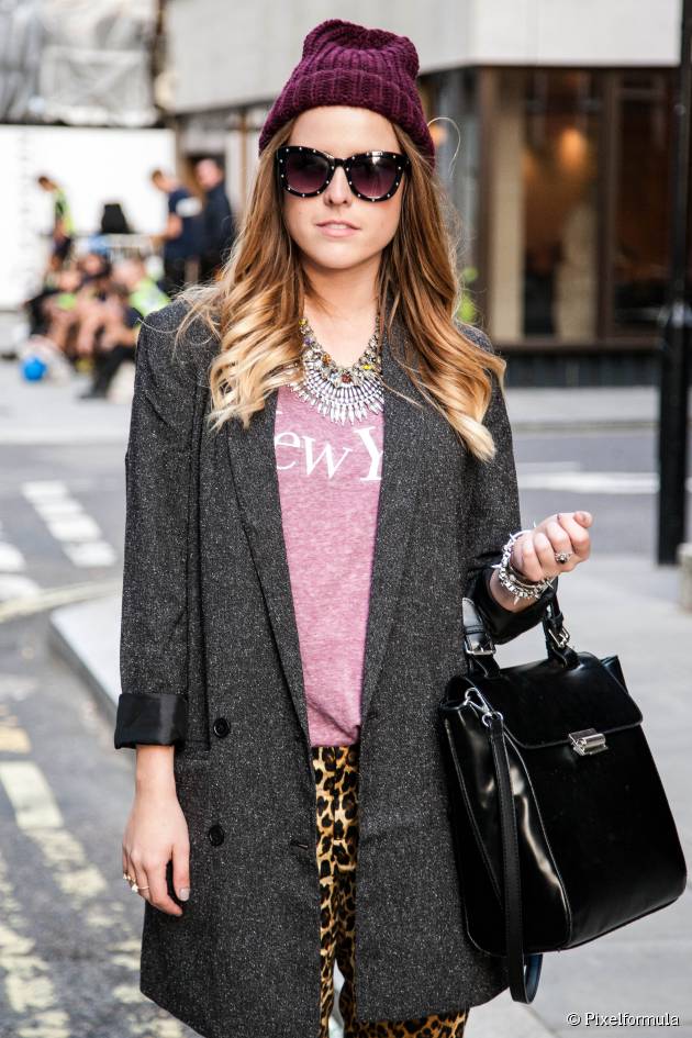 Il suo look? Molto eclettico. La nostra fashionista abbina una felpa casual a pantaloni oversize leopardati e giacca grigio mélange. Un look azzardato ma perfetto grazie ad accessori chic e ad un’acconciatura sapientemente lavorata. Per chi ama seguire le tendenze ma senza strafare consigliamo una felpa casual ma chic, con dettagli in pizzo traforati o inserti in pelle. Ci piace anche il suo modo di portare il berretto! Non troppo calcato sulla testa, le dà un tocco di stile e preserva la sua acconciatura.