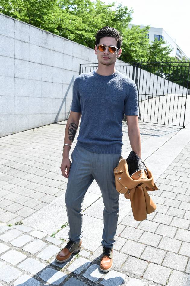 La sua pettinatura? Il nostro streetstyle del giorno ha lunghezze che richiedono di essere lavorate ogni giorno. I suoi capelli, ondulati, devono essere strutturati per poter creare una pettinatura impeccabile. Per lui l’ideale è puntare sul gel. Ogni mattina, dopo aver lavato i capelli, traccia la riga di lato e applica una noce di gel per dar loro la piega. Questo prodotto fissante gli permette di avere volume e di dare movimento a ogni ciocca.