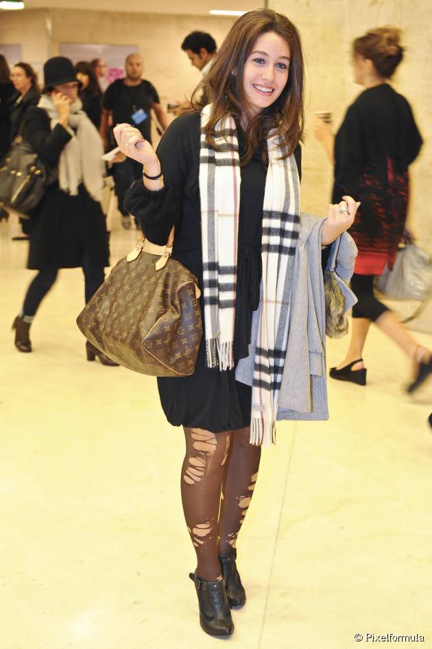 Il suo look? Un mélange tra stile classico e grunge. Con il suo tubino nero e la sua sciarpa a scacchi da ragazza di campagna chic, infatti, la nostra fashionista dissimula bene il suo gioco. Per coprire le gambe, invece, sceglie un paio di collant neri completamente bucati! Come se l’insostituibile tubino nero si potesse portare con tutto. Questo capo fondamentale, che ogni fashion victim che si rispetti deve avere, si porta in versione mini con collant opachi e stivali da motociclista oppure un po’ più lungo, ma mai sotto il ginocchio.